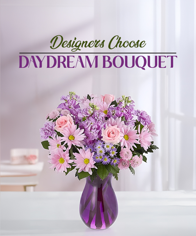 Just like a daydream, our delightful lavender bouquet is a gift that will linger on their mind. Hand-gathered with pops of pink and lush greenery, it arrives in our striking violet purple vase to capture its rich beauty, along with the thoughtfulness of your sentiment.